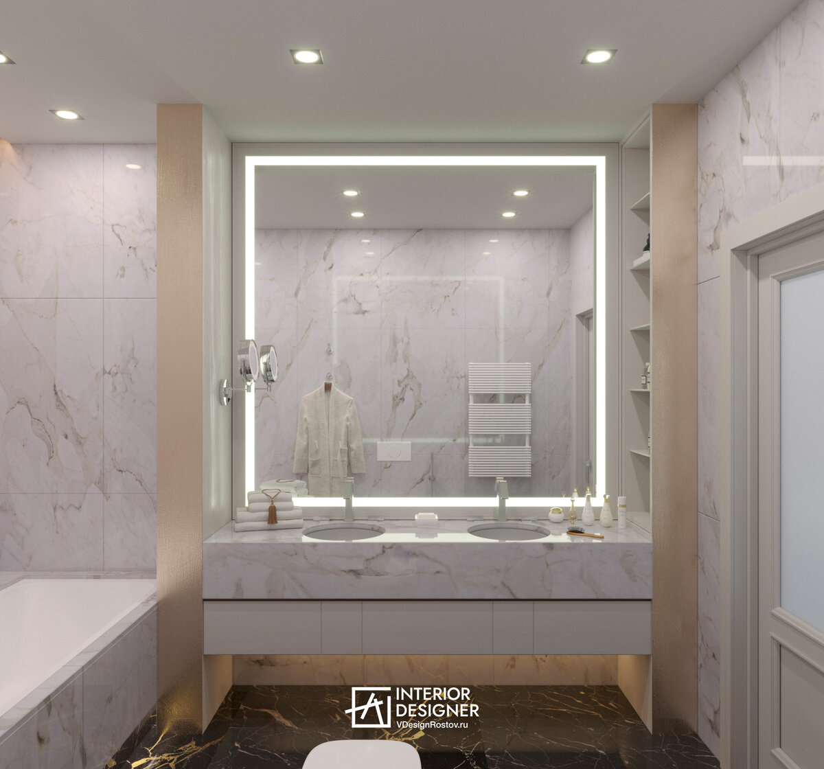 Продуманное пространство – то, в котором разделены зоны для гостей и хозяев. Такой формат был реализован в квартире клиентов моей студии https://promo.vdesignrostov.ru – семьи с ребенком из Ростова-на-Дону. Планировка была разработана таким образом, что в квартире разместилось два санузла: мастер-ванная и гостевая с душем. Заказчики получили максимально комфортное пространство, при котором приезд для гостей не будет осложнен бытовыми вопросами. Дизайн мастер-ванной Светлые потолок и стены гармонично контрастируют с темным полом. Их объединяет идентичный рисунок – имитация прожилок камня. Крупноформатная плитка позволяет добиться эффекта целостности. Поверхность стен напоминает разрез камня. Для удобства ванная комната дополнена двойной раковиной, большим и маленьким (макияжным) зеркалами. Дизайн гостевой ванной комнаты Оформление санузла продолжает каменную стилистику мастер-ванной. При этом используются упрощенные детали. Интерьер выглядит менее выразительно, но не теряет актуальности