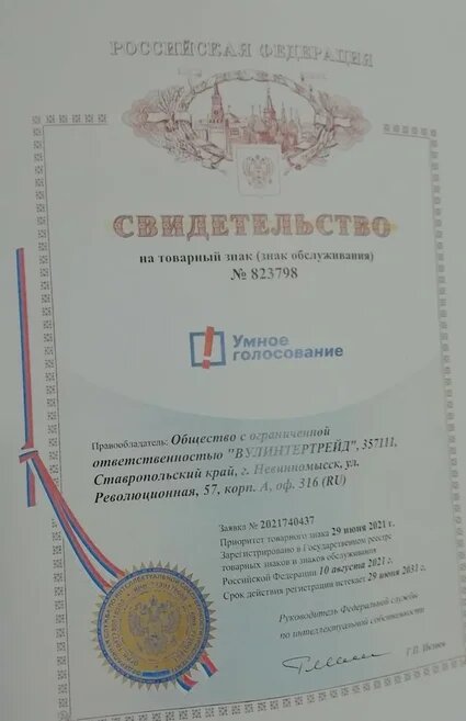 На сегодняшний день единственным правообладателем товарного знака является Общество с ограниченной ответственностью «Вулинтертрейд» (Российская Федерация, РФ). Место фактического расположения указанного Общества с ограниченной ответственностью ООО зарегистрировано по адресу Ставропольский край, Невинномысск, улица Революционная 57, кор. А, оф.316 (RU). Свидетельство на выше названный товарный знак Умное голосование (знак обслуживания), имеющее номер №823798 по заявке №2021740437 было выдано руководителем Федеральной службы по интеллектуальной собственности Г.П. Ивлеевым. Компания из Ставропольского края ООО Вулинтертрейд - один владелец ТЗ Умное голосование. Официальная регистрация уполномоченным лицом выше указанного товарного знака Умное голосование в Государственном реестре товарных знаков и знаков обслуживания Российской Федерации была проведена 10 августа 2021г. Приоритет товарного знака 29 июня 2021 года. Ну и тебе следует помнить о том, что проект под названием Умное голосование
