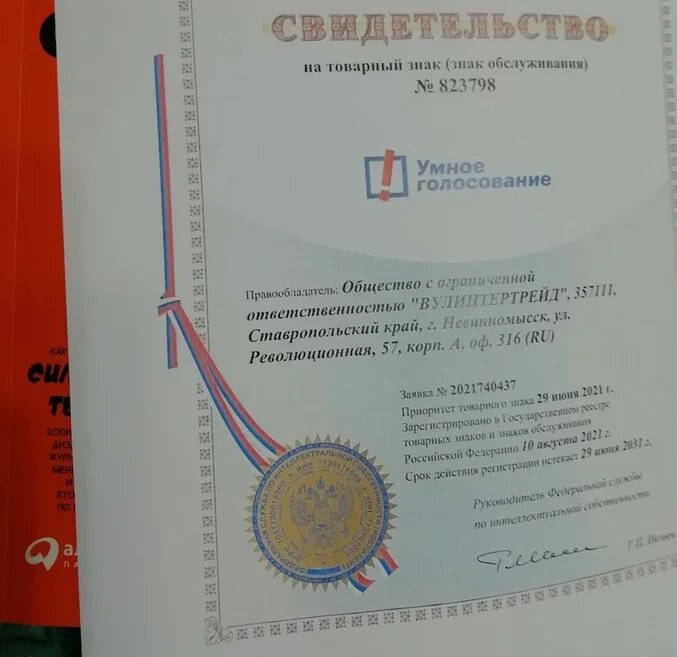 На сегодняшний день единственным правообладателем товарного знака является Общество с ограниченной ответственностью «Вулинтертрейд» (Российская Федерация, РФ). Место фактического расположения указанного Общества с ограниченной ответственностью ООО зарегистрировано по адресу Ставропольский край, Невинномысск, улица Революционная 57, кор. А, оф.316 (RU). Свидетельство на выше названный товарный знак Умное голосование (знак обслуживания), имеющее номер №823798 по заявке №2021740437 было выдано руководителем Федеральной службы по интеллектуальной собственности Г.П. Ивлеевым. Компания из Ставропольского края ООО Вулинтертрейд - один владелец ТЗ Умное голосование. Официальная регистрация уполномоченным лицом выше указанного товарного знака Умное голосование в Государственном реестре товарных знаков и знаков обслуживания Российской Федерации была проведена 10 августа 2021г. Приоритет товарного знака 29 июня 2021 года. Ну и тебе следует помнить о том, что проект под названием Умное голосование