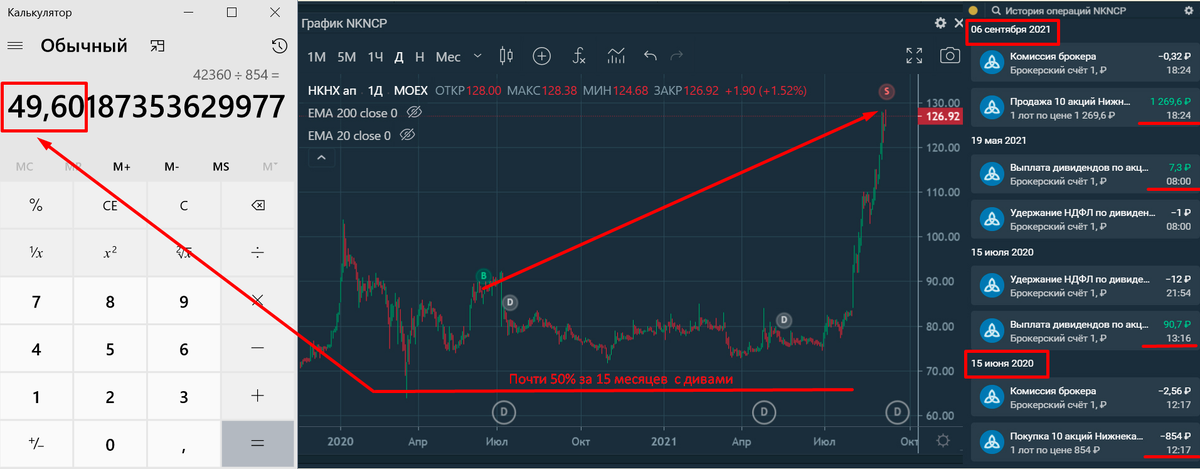 В июне 2020 года, открывал под высокие дивиденды ( более 10%) позицию по ПАО «Нижнекамскнефтехим» (тикер: NKNCP). Компания из Нижнекамска ( Татарстан) производит нефтехимическую продукцию и синтетический каучук. На тот момент процентные ставки в банках на депозитах были около 5%. ЦБ рекордно снизил ставки, соблазнился получить единаразово 2 годовую банковскую прибыль 😄 После див гэпа акция застряла в боковике. Наступила печалька. Потом пришла положительная новость, о поглощении Нижнекамскнефтехим одним крупным нефтехимическим гигантом - Сибуром плюс рекордные дивы. Прокатился почти на безоткатном росте. С учетом дважды выплаченных дивов получил почти 50% за 15 месяцев. 16 сентября будут выплачивать дивы и ждет очередной гэп, а 20 октября 2021 года произойдет само поглощение. Что там будет дальше неизвестно, поэтому зафиксировал прибыль. Дисклеймер: Не является торговой рекомендацией! Интересная статья ⏩Последний контракт на Магнит принем 1,73% за 5 дней
