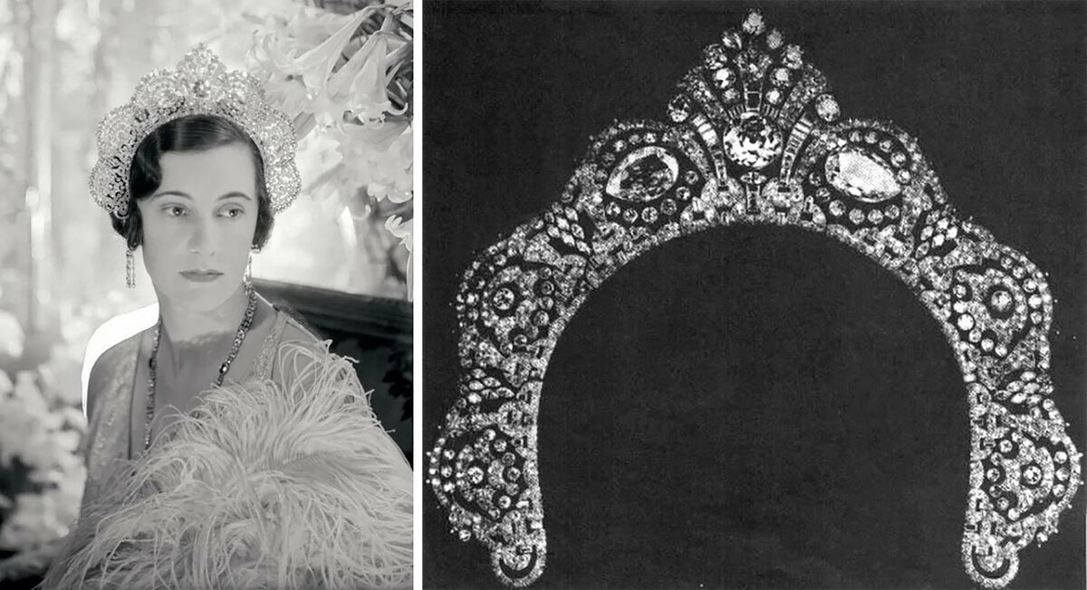 Тиара должна была ассоциироваться с Китаем. Но, как мы видим, в ней можно увидеть славянские мотивы. Бриллиантовая корона (по роскоши и красоте драгоценность как раз напоминает королевский венец) включала в себя не только тройку исторических бриллиантов. Но и хрустальную россыпь из 1400 более мелких камней. Когда лучи света падали на гладкие грани чудесных капель, казалось, что вокруг головы чарующей женщины вспыхивал огненный ореол.
