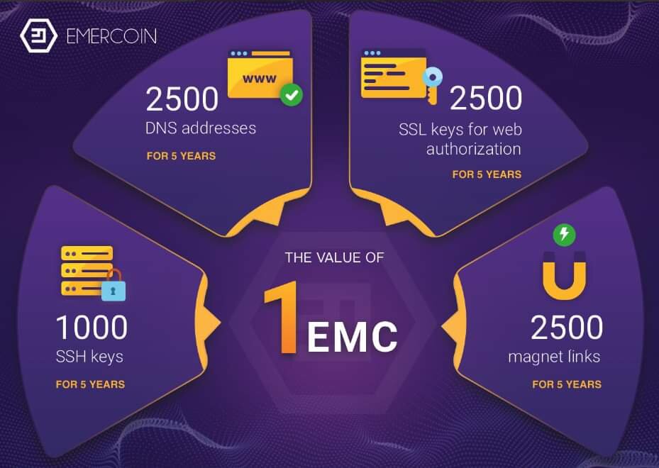 - Защита от сквоттинга основана на “сжигании” монет Эмеркоин при регистрации или обновлении записи.