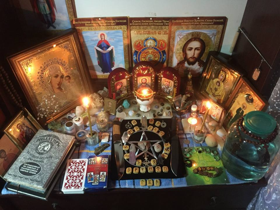 Картинка не моя. Я бы такой дуростью не стал заниматься. У меня в доме икон вообще нету. Давно избавился. Иконы, псалтирь, руны, свечи, четки и вода, наверное заряженная Чумаком? Пентакль, карты, камни всякие, ладан, лампадка, куски маятников..и один вопрос "ЗАЧЕМ ТУТ ТАКОЙ ВИНЕГРЕТ?" Еще бы добавить статуэтку Бафомета вместо майонеза. Кстати в астрале четко видны хаотичные молнии и локальный энергошторм над столом.
