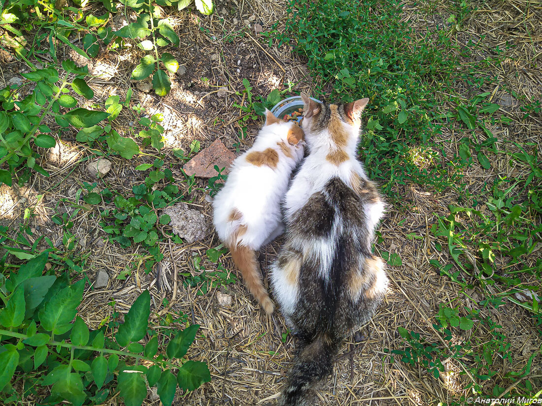 С виду сплошные ми-ми-ми. Славный пушистый котёночек и робкая изящная мамочка, неизвестно откуда взявшиеся в нашем саду. Кошечка ласковая, ручная, любит, чтобы её погладили и тут же начинает громко мурлыкать. Посмотришь на неё и никак не скажешь, что перед вами бесстрашная охотница на крыс. Позавчера притащила крысёнка. Обучала малыша навыкам охоты. Он не заробел, хотя и малыш совсем, все начальные упражнения добросовестно выполнил. Я помню, когда наша кошка Маруся, гроза мышей, а также и крыс, притащила маленького мышонка и положила перед своими маленькими котятами. Белоснежный котик Буда, который потом переехал на ПМЖ в Москву, сразу показал, что он мужик, герой и охотник. Гонял эту мышку по террасе как футбольный мяч. А вот кошечка Черепашка испугалась, залезла под стол и долго наблюдала издалека. В конце-концов, она тоже научилась ловить мышей, потому что Маруся строго спрашивала. Но крыс Черепашка пока не приносила, в этом деле у нас Маруся чемпионка. В общем, не у всех кошек та
