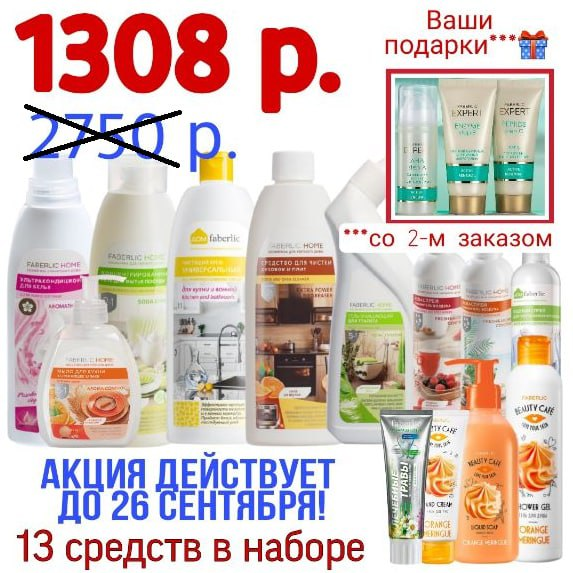 Для приобретения заполняйте анкету https://clck.ru/WY6mB 🍁 Состав набора за 1308 руб.: 1) Кислородная профилактическая зубная паста «Лечебные травы», 75 мл. 2) Питательный крем для рук «Апельсиновая меренга» Beauty Cafe, 75 мл. 3) Гель для душа «Апельсиновая меренга» Beauty Cafe, 200 мл. 4) Жидкое мыло для рук «Апельсиновая меренга» Beauty Cafe, 200 мл. 5) Гель очищающий для туалета 5 в 1 «Цитрусовый микс» FABERLIC HOME, 500 мл. 6) Средство для чистки духовок и плит «Сила цитрусов» FABERLIC HOME, 500 мл. 7) Мыло для кухни, устраняющее запахи «Сладкий апельсин» FABERLIC HOME, 300 мл. 8) Чистящий крем для кухни и ванной, 470 мл. 9) Концентрированный гель для мытья посуды 2 в 1 «Сода эффект» Faberlic Home, 500 мл. 10) Спрей водный для разглаживания белья, 250 мл. 11) Ультракондиционер для белья концентрированный «Ароматерапия Розовый бархат» FABERLIC HOME, 250 мл. 12) Акваспрей-освежитель воздуха «Апельсин с корицей» FABERLIC HOME, 250 мл. 13) Акваспрей-освежитель воздуха «Ягодная мелод