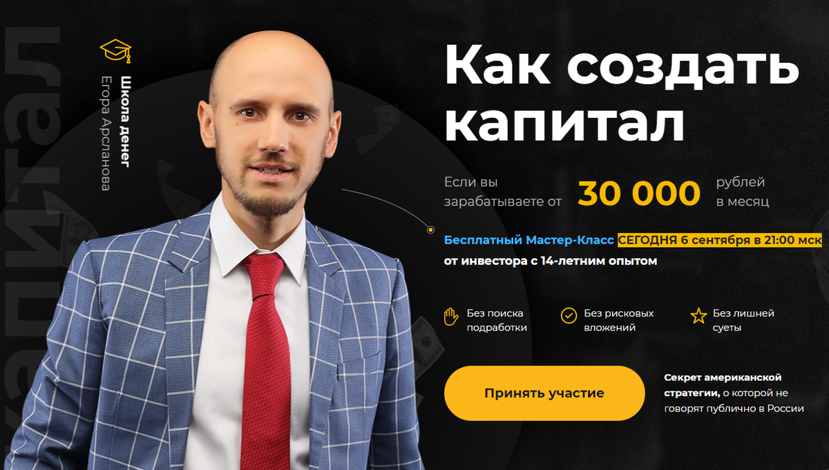 В настоящее время стартует бесплатный мастер-класс Егора Арсланова, целью которого является повышение финансовой грамотности и обучение созданию личных дополнительных источников заработка. Это те знания, которые остро необходимы в современной реальности и их можно бесплатно получить перейдя по следующей ссылке.