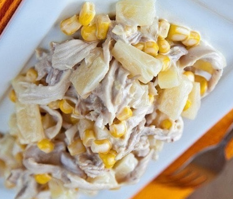 Ингредиенты: Филе курицы 350 г. Консервированная кукуруза 200 г. Ананасы консервированные 600 г. Легкий сыр 600 г. Сметана 3,5 ст. л.