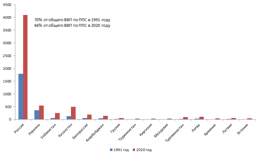 Часть 1 Перейдем к исследованию основных тенденций в экономиках на постсоветском пространстве. Рассмотрим для начала изменение объема ВВП по ППС. Картина получается довольно забавная. В 2020 году Россия (она же РСФСР в 1991 году) сохранила за собой абсолютное лидерство по абсолютному значению ВВП, но при этом несколько снизила долю в общей совокупности - с 70% до 66%. На втором месте в 1991 году была Украинская ССР с 14%. В 2020 году Украина сохранила за собой второе место, но уже с 8,7% доли. На третьем месте месте - Казахская ССР/Казахстан с 4,9% и 8% соответственно. Рассмотрим относительный прирост ВВП по ППС и выявим явных лидеров. Ниже среднего уровня приросли ВВП России и Украины. РСФСР имела наибольшую экономику в 1991 году среди исследуемых стран, но взяла на себя все долги СССР, что отрицательно сказалось на возможностях к быстрому росту. С Украиной все более менее понятно. Тут можно без комментариев. Часть стран получила эффект низкой базы, а также начала усиленно эксплуатиро