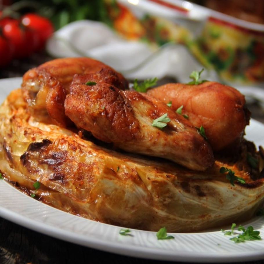 Капусту нарезать на шайбы толщиной, примерно, 3 см. Выложить капусту в жаропрочную форму, предварительно смазанную маслом. Капусту сбрызнуть сверху растительным маслом, подсолить и, по желанию, присыпать паприкой. С помощью кисти равномерно распределить масло и паприку по поверхности капусты. На капусту выложить замаринованные кусочки курицы.