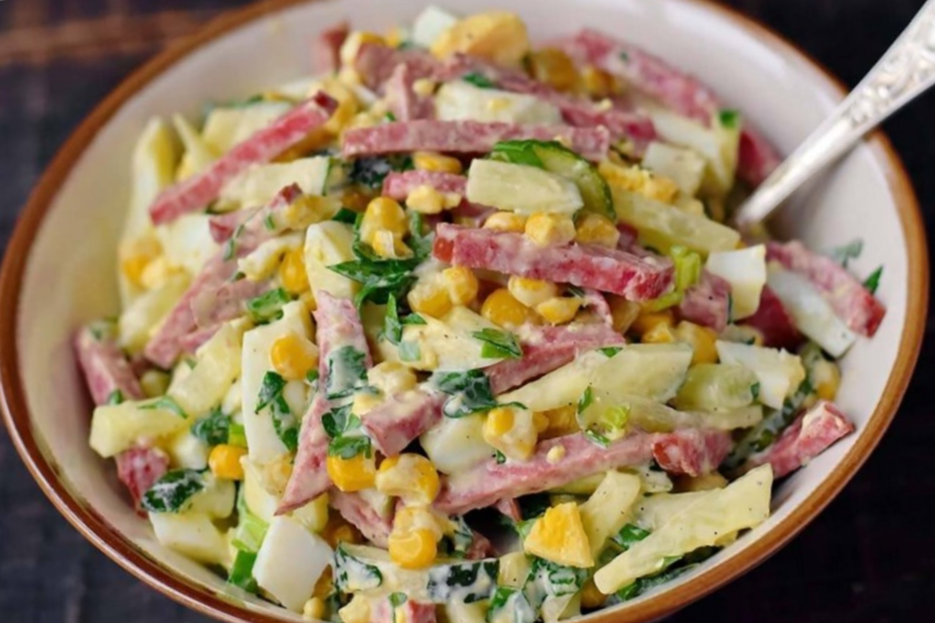 1. Колбасу нарезаем соломкой среднего размера или мелким кубиком.