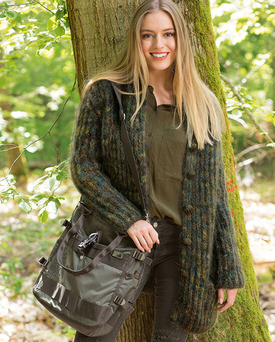 Меланжевая пряжа с большим содержанием мохера и использование довольно толстых спиц делают патентный узор этого кардигана еще более рельефным.