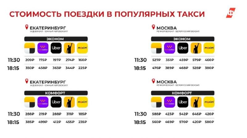 «ФедералПресс» сравнил стоимость поездок на самых популярных федеральных агрегаторах такси. В Москве был выбран условный маршрут от Речного до Белорусского вокзала – около 12 километров. Для сравнения цен в провинциальных городах был взят Екатеринбург с маршрутом от железнодорожного вокзала до Южного автовокзала – около 6 километров.