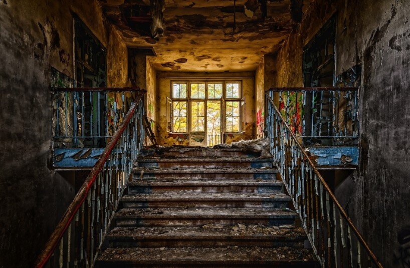 Попытка передвигаться на двух ногах, как это делают все нормальные люди, успехом не увенчалась, и я решила, что выпендриваться и кому-то что-то доказывать в пустом, заброшенном доме не имеет никакого смысла - встала на четвереньки и поползла к лестнице, где меня ждал очередной неприятный сюрприз. Не знаю, сколько лет эти руины сиротливо гнили посреди леса, но доски на ступенях подпортились основательно. Вдобавок на улице шёл дождь, и с потолка накапало множество разного размера лужиц, что делало моё путешествие ещё более экстремальным.