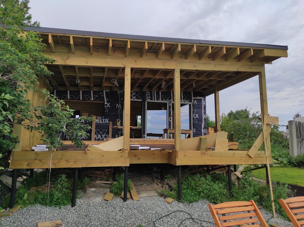 Каркасная технология, тем и отличается, что какие-то работы можно вообще не выполнять, так как в большинстве случает в качестве фундамента, используют винтовые сваи. Обычно, если участок ровный и сваи не находятся на высоком перепаде, то зашивать цоколь нет необходимости, ну если позволяют средства, то это можно сделать. Наша баня стоит на берегу водоема, перепады высот очень большие, в одной точке это 40см в другой доходит до 1.5 метров, соответственно зашить цоколь было необходимо. Чисто для красоты. Вариантов было много, рассматривали металлический сайдинг, имитацию бруса, панели из пластика, те что идут для отделки цоколя, но в итоге остановились на мягкой черепице. Правда пришлось немного потратиться, так как под данную черепицу необходима подготовка, купили плиты ОСП-12мм. Покупали со слезами на глазах, по цене 2300 руб за один лист. Сделали обрешетку из брусков и прикрутили плиты. Плиты обработали праймером по месту. Затем прибили мягкую черепицу. Прибивали гвоздями. Углы из это