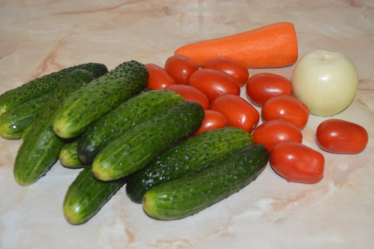 Друзья, привет! Вот вам рецептик моего любимого консервированного салата. Все как обычно просто, справится любой. Вобщем запасаемся пока цены на огурцы помидоры не полетели выше МКС)))). Внизу статьи подробное видео. Состав простейший Огурцы Помидоры, тут кстати, должен уточнить, в моём детстве (было это давненько уже ))) мама клала зелёный помидоры, у меня таких нет обойдусь обычными Морковь Лук Режем огурцы и помидоры колечками 3-4 мм. лук как угодно, я режу достаточно крупно, морковь или на тёрке, или , как я соломкой, ну и тоненькие кружочки ни кто не запрещает)) Специи только перец, чёрный и по 1 горошине душистого на 1 банку, у меня смесь перцев, чёрный красный белый. Когда салат порезан, лучше его взвесить(по возможности, конечно), так проще посчитать соль, нужно 13-15 гр. на 1 кг. ну или кладите "на глаз"))) Дальше все просто, засыпаем салат солью, перемешиваем, даём 10-15 минут постоять, овощи дадут сок, раскладываем по банкам, добавляем перец, уксус и подсолнечное масло. Уксу