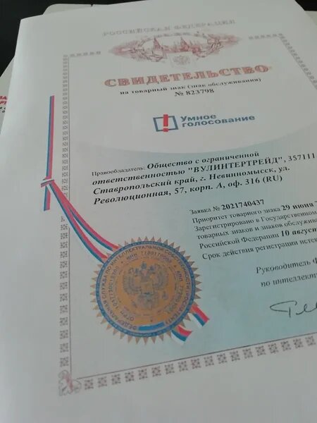 На сегодняшний день единственным правообладателем товарного знака является Общество с ограниченной ответственностью «Вулинтертрейд» (Российская Федерация, РФ). Место фактического расположения указанного Общества с ограниченной ответственностью ООО зарегистрировано по адресу Ставропольский край, Невинномысск, улица Революционная 57, кор. А, оф.316 (RU). Свидетельство на выше названный товарный знак Умное голосование (знак обслуживания), имеющее номер №823798 по заявке №2021740437 было зарегистрировано руководителем Федеральной службы по интеллектуальной собственности Г.П. Ивлеевым. Компания из Ставропольского края ООО Вулинтертрейд - владелец ТЗ Умное голосование. Официальная регистрация уполномоченным лицом выше указанного товарного знака Умное голосование в Государственном реестре товарных знаков и знаков обслуживания Российской Федерации была выполнена 10 августа 2021г. Приоритет товарного знака 29 июня 2021 года. Ну и тебе следует помнить о том, что проект под названием Умное голосо