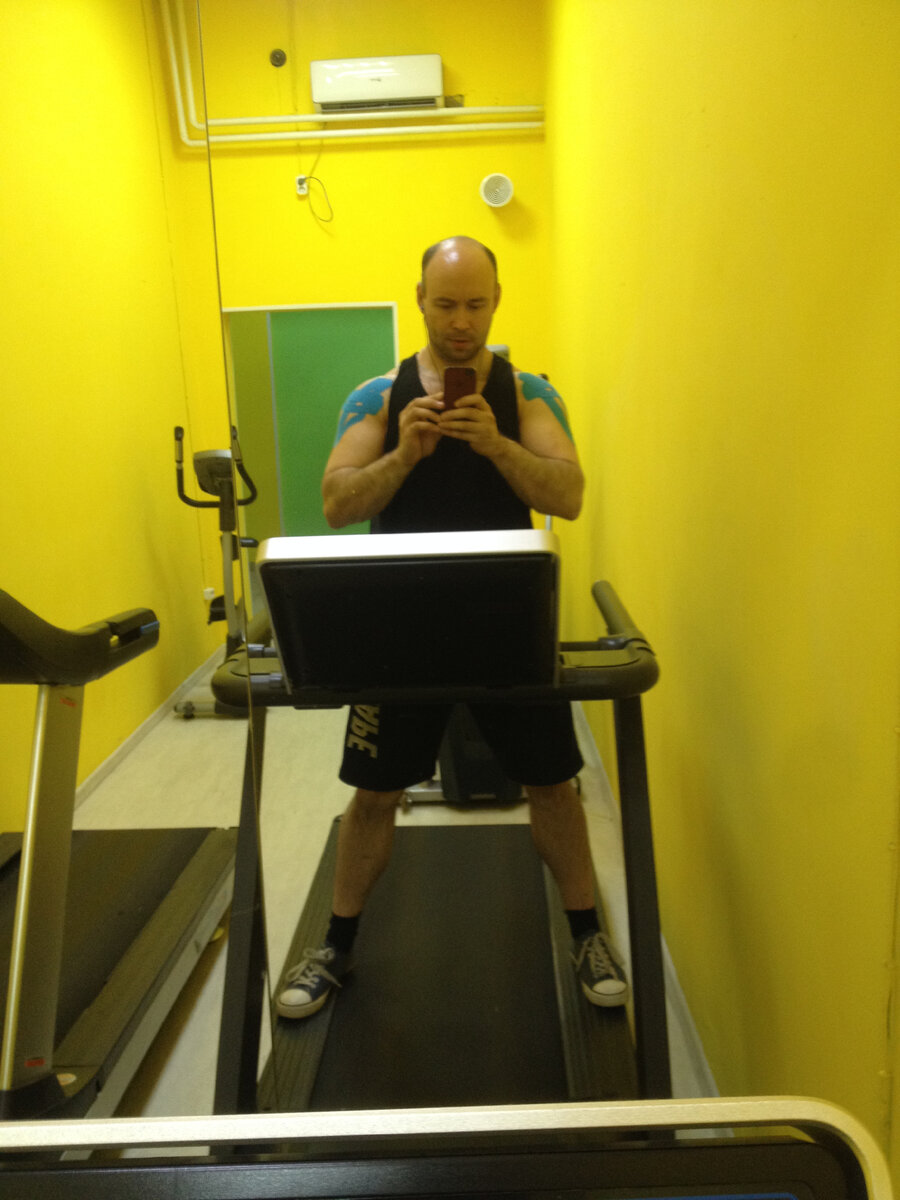 Тренировку начал, как обычно, в начале легкая растяжка плечевого и локтевого суставов, затем кардио на 10 мин., чтоб лучше разогрелось тело и связки, потом более тщательная разминка плечевого пояса и наконец перехожу к жиму. Сейчас, жим выполняю с небольшим весом в изоляции, с поднятыми ногами, так как подобный вариант максимально грузит дельты, то лучший вариант, чтоб проверить эффективность тейпов.