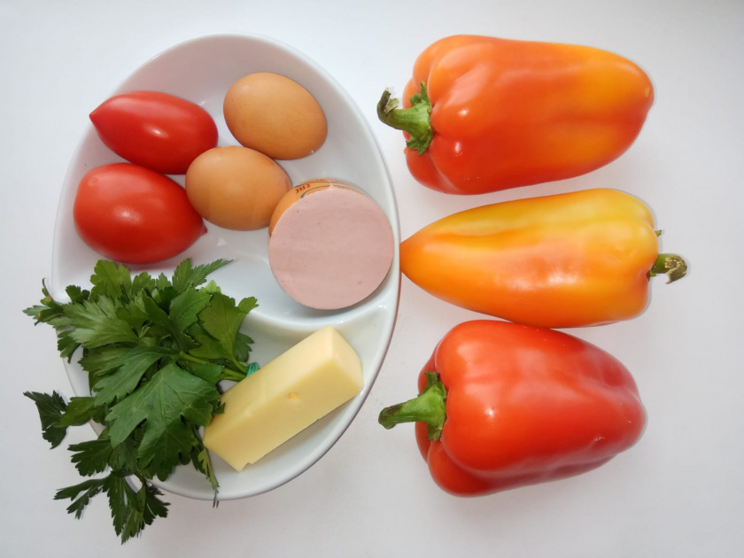 Специи по вкусу (соль, перец, сушеный чеснок) Приготовление: 1. Натереть на терке сыр, нарезать мелким кубиком колбасу и помидоры, порезать мелко зелень. 2. Все ингредиенты смешать, добавить яйца и специи. 3. Перец порезать кольцами, убрать внутри семена. Выложить кольца на сковородку, смазанную растительным маслом. 4. Внутрь выкладывать начинку и жарить на небольшом огне с обеих сторон в целом минут 5. Завтрак готов! Можно подавать на стол - кольца отлично сочетаются с черным хлебом! Если любите - добавьте майонез или сметану. Приятного аппетита!