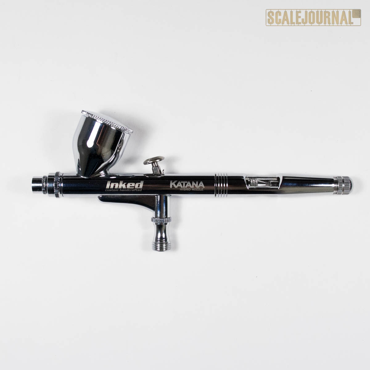 В этой статье я расскажу про аэрограф Inked Katana с соплом-звездочкой. Аэрограф упакован в яркую и красочную коробку из плотного картона. На коробке дана краткая информация об аэрографе на двух языках: русском и английском. В комплект входит пластиковый бок аэрограф и инструкция на русском языке. В инструкции есть стандартное описание аэрографа, его особенности, описан процесс чистки и есть подробная схема устройства аэрографа. В комплект не входит переходник для быстросъемной муфты. Это не критично, но было бы не плохо, если бы все производители такой переходник вкладывали в стандартную комплектацию. Особо описывать устройство смысла не вижу, т.к. Inked Katana это аэрограф использующий классическую схему работы, двойную независимую. С помощью триггера мы можем регулировать как подачу воздуха, так и краски. У меня аэрограф с соплом 0,2 мм (опционально 0,3 мм), есть ограничитель хода иглы, бачек объемом 9мл со съемной крышкой. Аэрограф не из легких – вес 126 грамм. Он немного тяжелее
