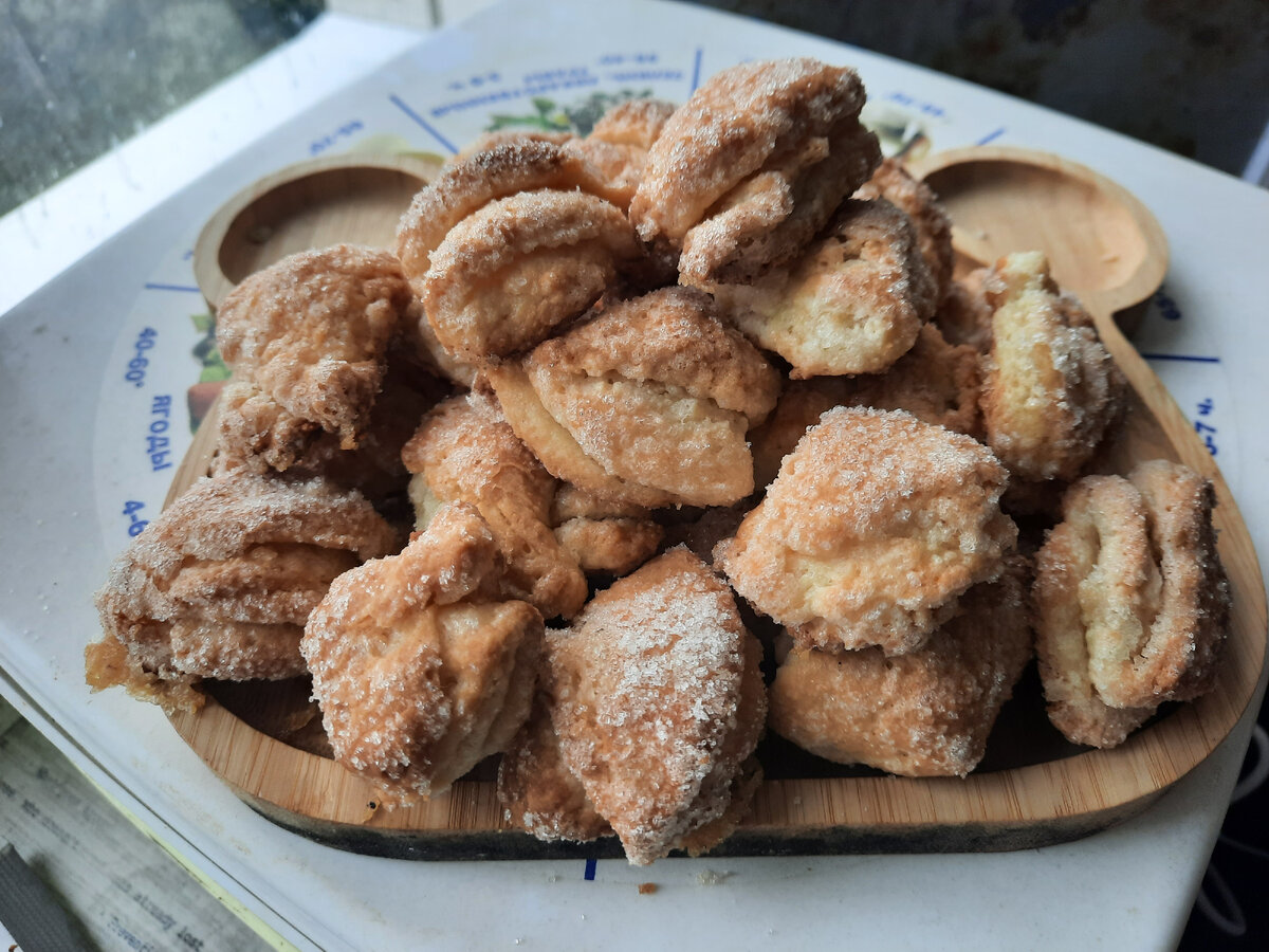 Вкусные треугольнички с творогом. Пальчики оближешь! У меня осталось 300 грамм творога, и я решила приготовить творожное печенье. Угощение по тому рецепту получается очень вкусным! Ингредиенты: Творог (любой) - 300 гр. Мука - 1,5 стакана Сливочное масло (комнатной температуры) - 100 гр. Сахар (1 столовая ложка для теста) + полтора стакана на обсыпку. Яйцо - 1 штука Разрыхлитель - 10 гр. Ванильный сахар - 1 щепотка Соль - 1 щепотка Смешиваем все ингредиенты. Получаем нежное тесто, которое немного липнет и убираем его в холодильник на 1 час. Через Час достаём тесто и раскатываем его в тонкий пласт (примерно 3-4 мм) Далее вырезаем стаканом кружочки (у меня небольшого диаметра, а так- неважно, можно и крупные печененки) Каждый кружочек обмакиваем в сахарном песке, складываем сахаром вовнутрь, дальше снова обмакиваем в сахаре и сгибаем сахаром вовнутрь. Получается треугольничек, который мы с обеих сторон обваливаем в сахаре и выкладываем на пергамент или просто сразу на противень, смаз