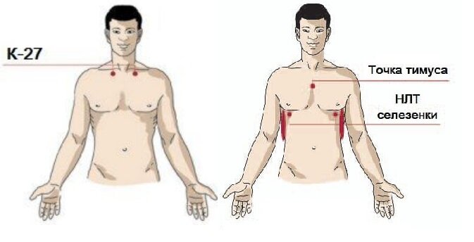 Чтобы поддержать иммунитет, каждый день по 20-30 секунд простукивайте три точки на теле: 1. К-27 (под ключицами) 2. Точку тимуса (вилочковой железы) 3. Нейролимфатические точки селезенки К-27 Как найти 1. Поместите пальцы на бугорки ключиц. 2. Спуститесь примерно на 2,5 см вниз и немного в стороны. 3. Тут нащупаете ямку. Это и есть точки К-27. Как простукивать Точки простукиваем двумя пальцами вместе – указательным и средним. Простукивайте эти точки обеими руками. Руки при этом можно держать параллельно друг другу, когда правая рука постукивает правую точку К-27, а левая – левую, либо перекрестить. То есть правая рука будет постукивать левую точку К-27 и наоборот, а левая – правую. Скрещенные руки дополнительно синхронизируют работу правого и левого полушария. Ощутимо постукивайте точки. Если вы все делаете правильно, то почувствуете вибрацию в месте простукивания и характерный звук. Во время простукивания глубоко и ритмично дышим. Вдох через нос, выдох через нос или через рот. Чем пом