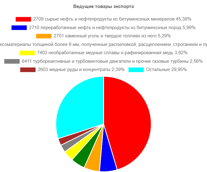Экспорт из России в Китай в январе - июне 2021 г. составил 27,83 млрд. USD по стоимости при объёме грузоперевозок 81,26 млн. тонн. По сравнению с январем - июнем прошлого 2020 года зафиксировано увеличение экспорта на 18% в стоимостном выражении при уменьшении на 2% массы вывезенного товара. Согласно БД статистики российской внешнеэкономической деятельности в товарной структуре экспорта в Китай ведущее места заняли топливо минеральное, нефть и продукты их перегонки; битуминозные вещества; воски минеральные (60.11% стоимости), руды, шлак и зола (6.83%), древесина и изделия из нее; древесный уголь (6.47%), медь и изделия из нее (4.15%) и оборудование и механические устройства (2.75%). Товарная структура российского экспорта в Китай При этом сырых нефти и нефтепродуктов из битуминозных минералов (код ТНВЭД 2709) было вывезено в Китай на сумму 12,63 млрд. USD массой 28,44 млн. тонн при возрастании экспорта на 1,69%. В предыдущей публикации мы рассмотрели экспорт сырой нефти из России - Ки