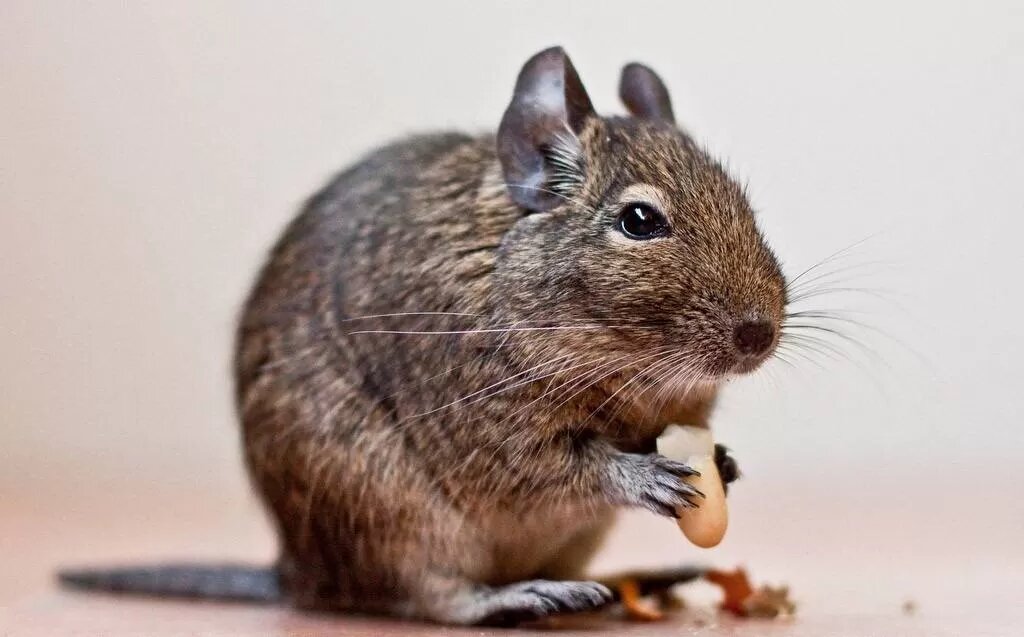 В природе грубая клетчатка составляет до 60% рациона дикой дегу. Остальная часть их рациона состоит из естественной растительности, найденной на равнинах и горах Чили, которые являются частью их среды обитания. Большая часть рациона домашних дегу должна состоять из высококачественного сена. Сено не должно быть коричневым, зеленым, так как зеленое сено может вызвать вздутие живота. Розовое или белое сено следует выбросить, так как это признак плесени. Сено с люцерной стоит давать ограничено, так как его потребление повышает риски нарушения обмена солей. Существуют промышленные корма, как правило они содержат все необходимые витамины и минералы. Однако, стоит убедиться что они не содержат патоки или сахара, так как они могут привести к диабету. Воду для питомца следует обновлять каждый день. Предпочтение стоит отдавать напольным керамическим поилкам. Для дегу, как и для всех других животных, требуется сбалансированная диета с рядом витаминов и минералов. Наиболее важно содержание каль