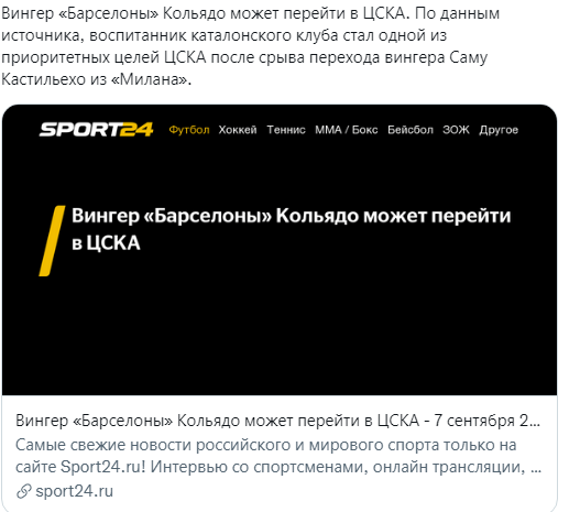 ЦСКА, после срыва возможного варианта аренды полузащитника "Милана" Саму Кастильехо, срочно ищет другой вариант на замену проданному Влашичу. Одним из таких вариантов называется полузащитник "Барселоны" Алекс Кольядо. Алекс Кольядо перейдёт в ЦСКА? Агент игрока Марк Санльехи уже прокомментировал данную информацию, подтвердив, что его клиентом интересуется клуб из России, но как он утверждает, сам Алекс не особо стремится уехать из столицы Каталонии. Он хочет остаться в клубе и постарается побороться за место в основе. Для ЦСКА Кольядо на данный момент самый приоритетный вариант. Скорее всего клуб попытается взять его в бесплатную аренду, так же как и пытались это сделать с Кастильехо. Кольядо очень интересный вариант: молодой, перспективный и техничный игрок. Для годичной аренды подходит отлично, ведь в этом году клуб не пробился в еврокубки, а значит не собирается много тратить. Возможно, если в этом году пробьёмся в еврокубки, руководство будет искать уже варианты для покупки игроко