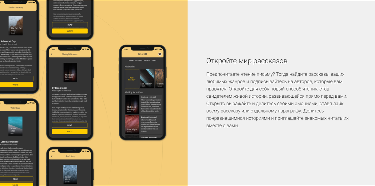 Социальная сеть для стори-теллинга Традиционные популярные социальные сети уже далеки от творчества. Это позволяет энтузиастам создавать новые ниши и предлагать аудитории новые платформы. Одной из такой платформ является LetsTell. На платформе участники сети создают и делятся своими рассказами в стилистике стори-теллинга. Данный стиль написания уже давно в тренде. LetsTell не решает никакой проблемы и не является решением какой-либо боли. Это классная возможность рассказать миру о своем писательском таланте и получить дополнительную мотивацию чтобы продолжить писать. Ведь огромное количество неопубликованных работ пылится в шкафу или забытых текстовых файлах. Написание рассказа делится на абзацы, которые вы заполняете по ходу приходящего вдохновения. Иногда даже тривиальная история может оказаться популярной и обсуждаемой. Но самым важным плюсом LetsTell является возможность писать историю вместе. Ваши друзья могут присоединиться к вашей истории, дополнить ее и сделать рассказ более об