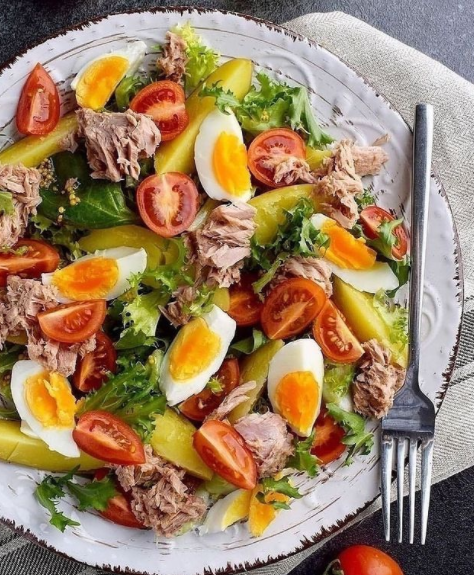 Отварите картошку и яйца и нарежьте на дольки. На тарелку выложите листья салата, полейте смесью оливкового масла и горчицы. Дольками порежьте помидоры. Разложите картофель, яйца и помидоры на листья салата. Сверху выложите тунец и оливки. Посолите, поперчите по вкусу. #рецепты #салаты рецепты #нисуаз #салат на праздничный стол #правильное питание и похудение