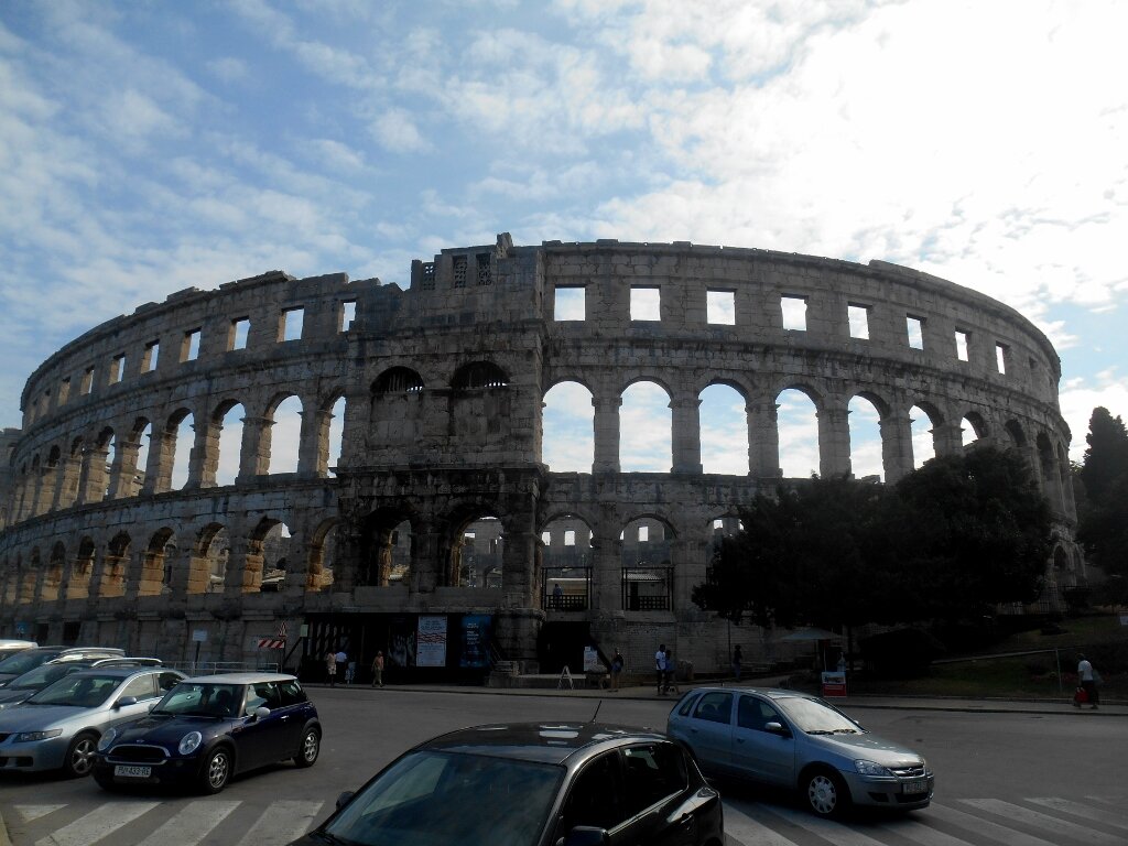 Сам факт, что в Истрии повсюду ощущается влияние Италии не удивителен, если вспомнить историю Истрии. Полуостров был все время частью великих империй, начиная с древней Римской, о чем свидетельствуют великолепно сохранившиеся до наших дней дороги и акведуки. А в самом большом городе Истрии Пула или Pola c строго выверенной планировкой и прямыми, как стрелы, улицами, прекрасно сохранился огромный римский амфитеатр, выстроенный еще в первые века для гладиаторских боев. До сих пор называется, как прежде, Арена. При виде того, насколько он огромен и как прекрасно сохранился, возникает чувство удивления. Это практически копия, причем почти в натуральную величину, римского Колизея. Смотришь на него, и возникает чувство, словно ты перенесся и во времени и в пространстве, и оказался в Древнем Риме. Кажется, вот –вот и начнется представление, зрелище, бои гладиаторов или их сражения с дикими животными. Арена огромная, вмещала 2000 зрителей, и сейчас в это трудно поверить еще и потому, что г