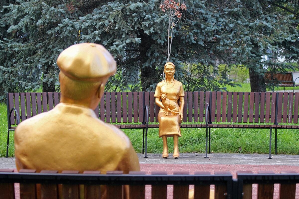 Самый запоминающийся объект городского благоустройства в Луге, который попался мне на глаза - это, безусловно, сквер на проспекте Урицкого, украшенный двумя скульптурами - мужчины и женщины. Их видно издалека по той причине, что они сверкают на солнце. Ведь исполнены в... золоте! Точнее в материале, который напоминает этот драгоценный металл.