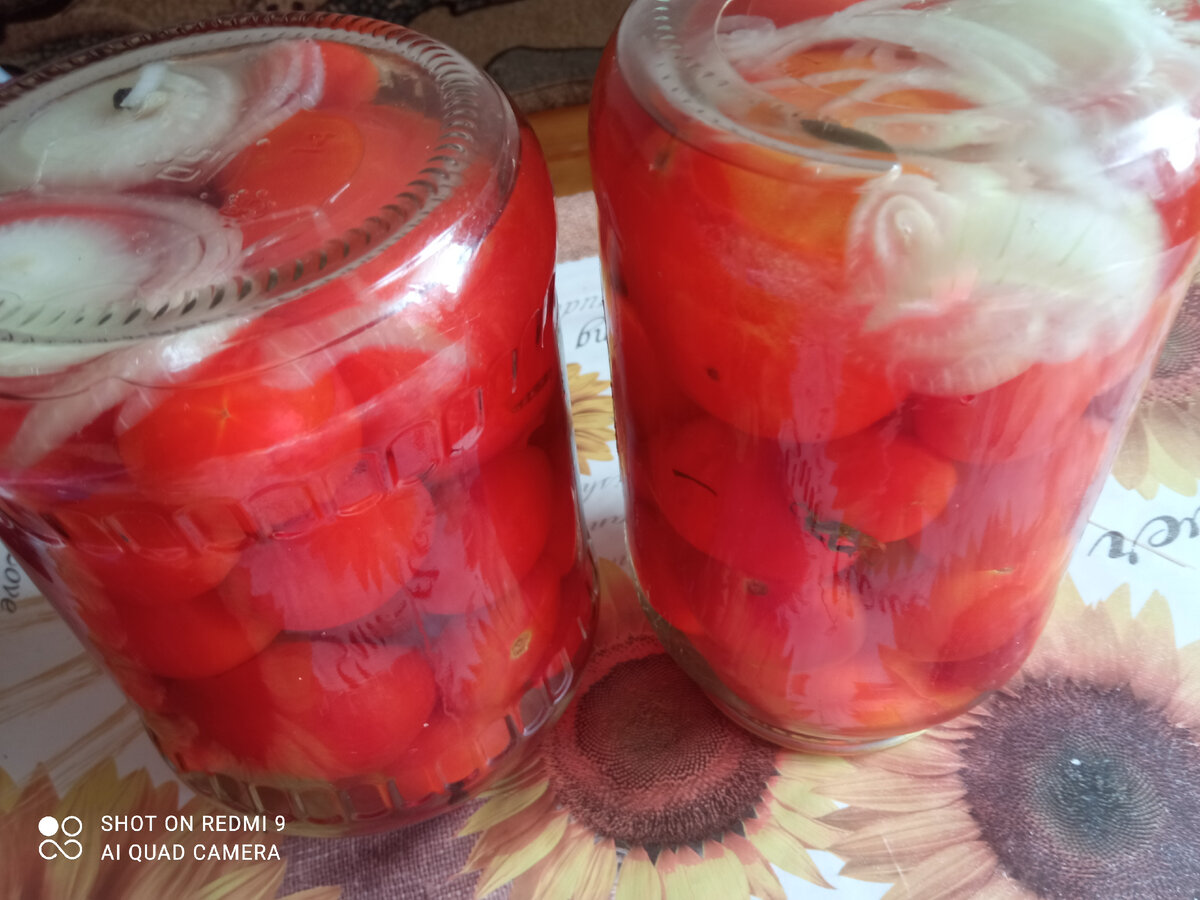 Сейчас самое время заняться заготовками на зиму, сделать припасы из помидор. Если Вы занимаетесь домашним консервированием, то предлагаю замариновать томаты по этому необычному и быстрому рецепту. Заготовка получается изумительно ароматной, на самом деле королевский рецепт. Способ простой и нереально вкусный. Консервация отлично хранится при комнатной температуре в шкафу. Попробуйте приготовить, а зимой предложите маринованные помидоры в качестве дополнительного или самостоятельного блюда. Это шикарное угощение под праздничные напитки. Уверена, что вам понравится. Готовится все очень просто и быстро, потребуется самый минимум специй. Ингредиенты: Маринад на 1,0 литр воды: Этапы приготовления: Беру чистую стерилизованную банку, в нее укладываю произвольно лук, нарезанный кольцами. Далее заполняю банку доверху помидорами, периодически встряхиваю, чтобы было меньше пустот. Томаты должны лечь плотно, их лучше брать с тонкой кожицей. Заливаю овощи кипятком, накрываю пропаренными крышками,