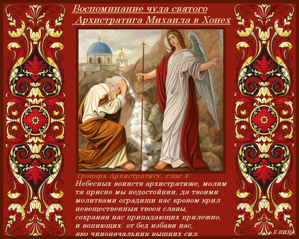 Молись под праздник Архангела Михаила под 19.09 (Чудо в Хонех) и под 21.11. его память, т.е. под Михайлов день, - молись в 12 часов ночи, ибо Архангел Михаил под свои праздники ночью находится на берегу долины огненной и опускает правое крыло в геену огненную, которая в это время гаснет. Молись под эти ночи и Он услышит молитву просящего, называя усопших по имени и проси, чтобы Он вывел их из ада. Помяни родных, знакомых и близких, называй, их имена добавляя при этом (и сродников по плоти до Адамова колена) /1/.