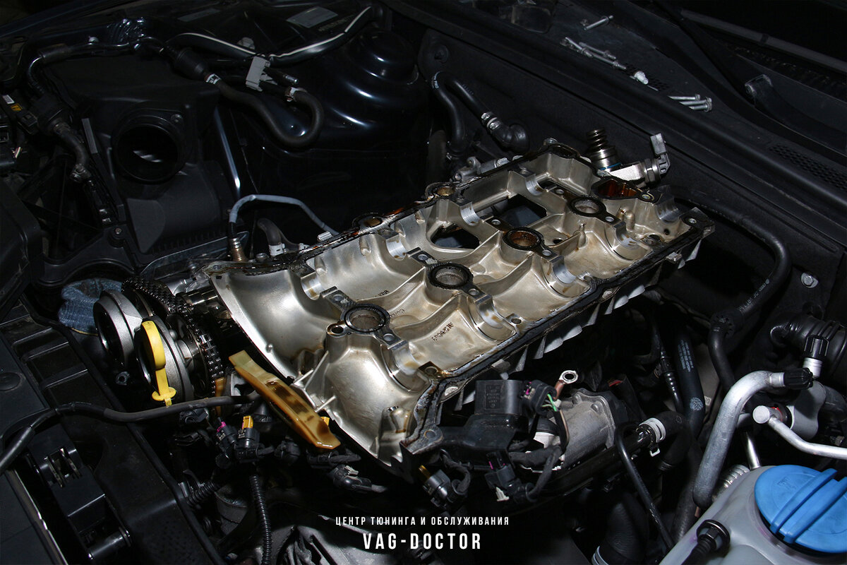 Осебенностью цепных двигателей 1.8 TFSI / 2.0 TFSI является клапанная крышка, которая выполняет роль верхней постели для распредвалов. Так как крышка является неотъемлимой частью ГБЦ, устанавливается она не на прокладку, а на герметик. Такая конструкция требует особого внимания при снятии и установки При проведении работ тщательно очищаем крышку и наносим анаэробный герметик. Проводим осмотр на момент правильности установки, проводим обкатку и повторно осматриваем мотор на момент подтеков масла