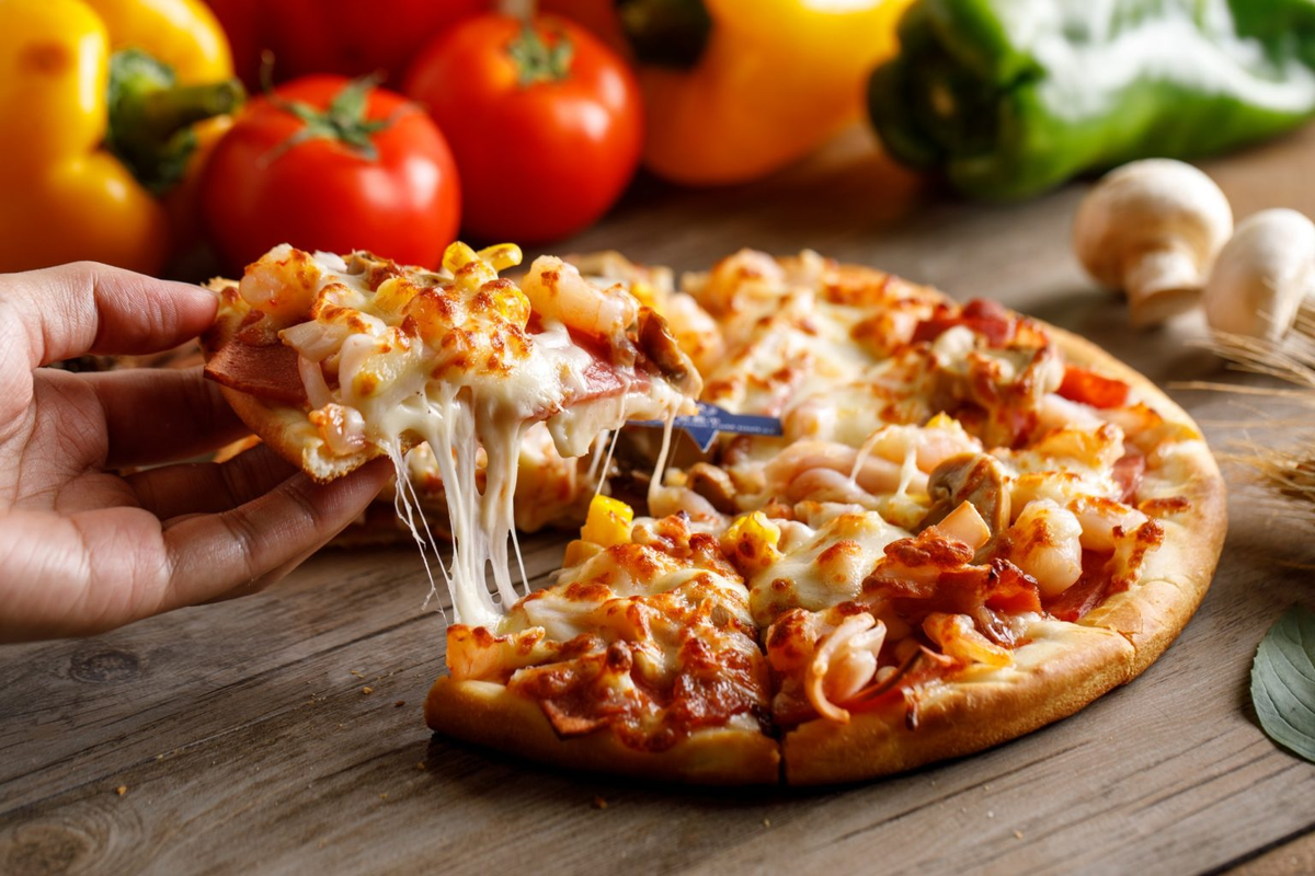 Переложить содержимое миски на припылённый мукой стол, замесить мягкое тесто. Скатать его в шар, накрыть полотенцем, оставить в тёплом месте на 1 час. После того как тесто поднимется, подмесить его и руками растянуть в лепешку толщиной 5-7 мм. Получится круг 33-35 см в диаметре.