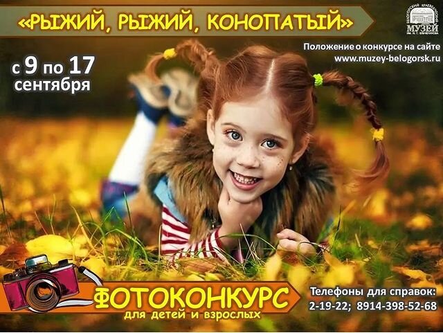 В Международный день рыжих музей Белогорска объявил фотоконкурс «Рыжий, рыжий, конопатый». Принять в нем участие златовласые жители города могут до 17 сентября. – Природа всегда удивляет нас яркими красками, но, пожалуй, самые восторженные ощущения неизменно вызывает горячий, огненный оранжевый цвет, – говорит специалист по экспозиционной и выставочной работе Татьяна Романова. – Осень может стать яркой и запоминающейся. Например, рыжей с рыжим настроением. Главное украшение фотоконкурса – люди, которых природа окрасила в рыжий цвет. Для участия в конкурсе необходимо отправить фотографию (в формате jpg) с заявкой на электронную почту belmuzey@yandex.ru. От одного участника принимается 1 фотография. Прием заявок и работ осуществляется с 9 по 17 сентября. С 20 по 23 сентября состоится голосование в конкурсном аккаунте @foto_konkurs_2021. http://belogorck.ru/novosti/segodnya-v-gorode/42833-ryzhij-ryzhij-konopatyj-v-belogorske-startoval-fotokonkurs