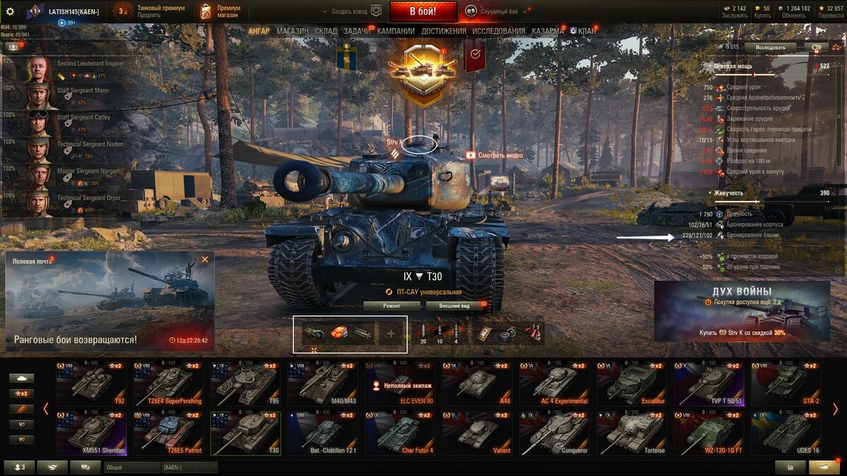 Добрый день господа и надеюсь дамы. Продолжаем одновременную прокачку двух веток американских пт-сау. Сегодня на очереди Т-30. ПТ-САУ 9-го уровня. Начну с того что мне повезло и я накопил свободный опыт для покупки сразу топового орудия. К слову оно не встает без топовых траков. Поэтому перехожу сразу к оборудованию. Первый усиленный слот: улучшенный прицел. Жизненно важно попадать и пробивать противника. Альфа у нас отменная, а вот точность далеко не лучшая. Необходимо это исправить. Второй слот: усиленная закалка. Чтоб поставить топовое орудие, нам не хватает грузоподъемности. Этот модуль, не смотря на свои другие не менее полезные особенности призван как раз за этим. Третий слот: досылатель. Но это не аксиома и он просто у меня лежал на складе и явно полезен для машины. Но приводы наводки были бы не менее полезны. Сведение у нас также прихрамывает. Еще одна сильная сторона этой машины, его замечательна и чертовски крепкая башня. А если приплюсовать к этому его шикарные УВН -10/15. Э