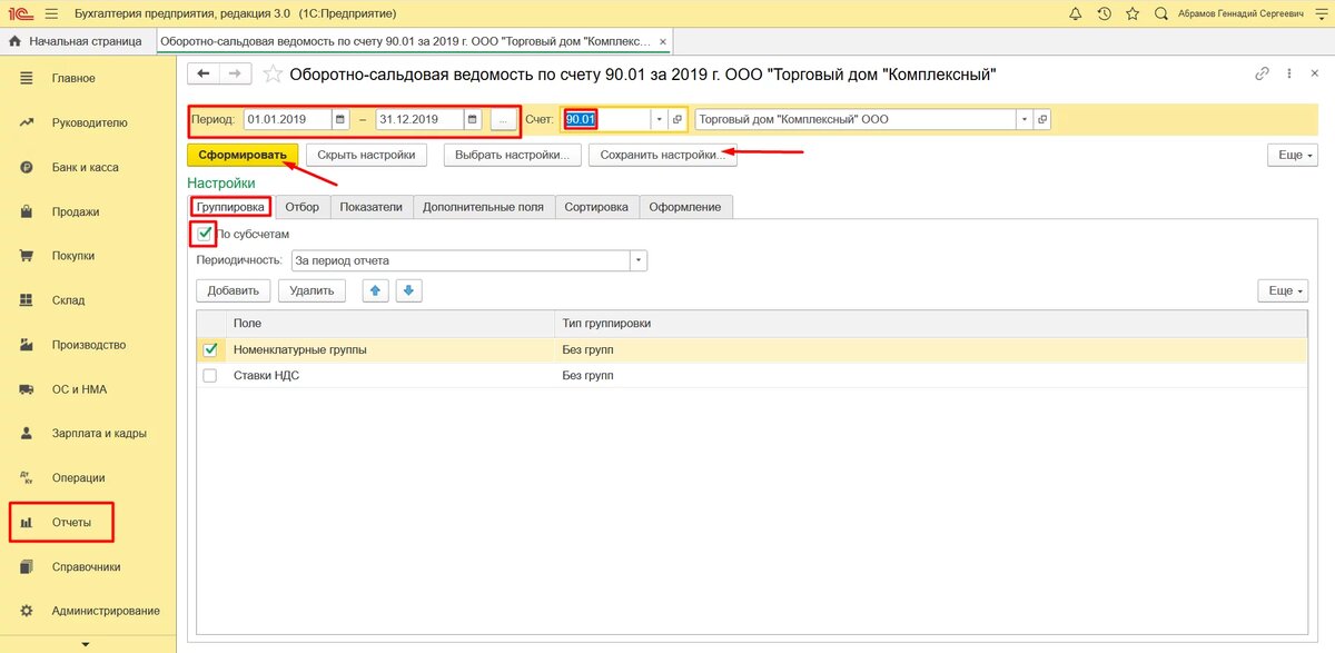 Для этого в меню «Отчеты» в разделе «Стандартные отчеты» необходимо выбрать «Оборотно-сальдовая ведомость по счету». В открывшемся окне установить период, за который формируется отчет, указать сч. 90.01, выбрать организацию.