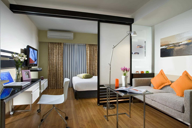 Ситуация, когда одна комната выполняет несколько функций, не нова. Далеко не у всех владельцев квартир есть возможность разделить гостиную и спальню, оборудовать отдельную комнату каждому ребенку, да еще и рабочий кабинет обустроить. Приходится на ограниченной площади размещать все, что нужно для жизни, стараясь сделать это так, чтобы комната не выглядела беспорядочным нагромождением вещей. Итак, стоит задача гармонично совместить спальню и парадный зал, в котором не стыдно принять гостей. Как это сделать? Просто приобрести удобную полуторку или духспальную супружескую кровать, и поставить ее в свободном углу не получится. Да, такой дизайн тоже возможен, но доставляет впоследствии немало неудобств. Спальня – это личное пространство, которое не стоит демонстрировать посторонним людям. А ведь бывают ситуации, когда человек приболел и ему нужен постельный режим, или он спит после ночной смены. Поэтому, необходимо предусмотреть не просто зонирование цветовыми оттенками или оформлением, но