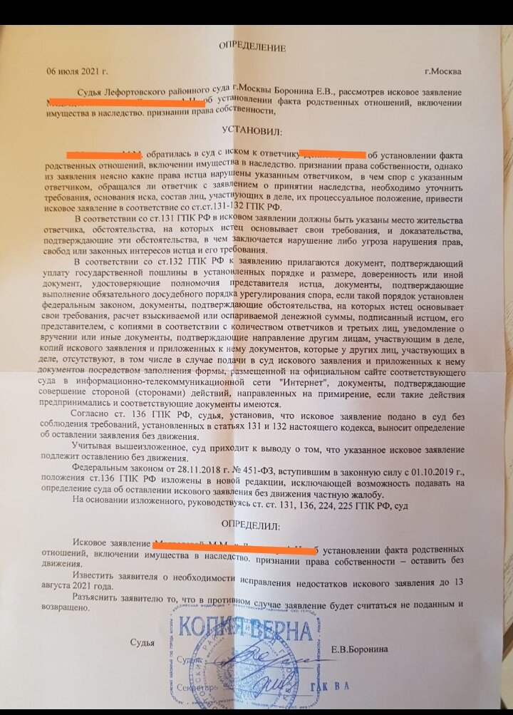 С такой судейской наглостью мне пришлось столкнуться впервые. Ситуация стандартная в принципе: судье надо было в отпуск, и она по надуманным основаниям оставляет иск без движения. В чем суть спора У клиентки умерла мама, но её свидетельство о рождении не сохранилось ни в семейном архиве, ни в ЗАГСе. То есть она не могла вступить в наследство, и получила отказ от нотариуса. Наследованию помимо всего прочего подлежала квартира. Однако в выписке из ЕГРН оказалось, что данные о маме внесены с ошибкой. Следовательно, квартира не может входить в наследственную массу. Мы подаём в суд иск об установлении факта родственных отношений с наследодателем, включении квартиры в наследственную массу и признании права собственности в порядке наследования по закону. Ответчиками указываем нотариуса и второго наследника. Третьим лицом, на всякий случай, прописываем Росреестр. Что придумала судья Нежелание судьи рассматривать иск было видно сразу. В определении она указала следующее: Надо отметить, что так