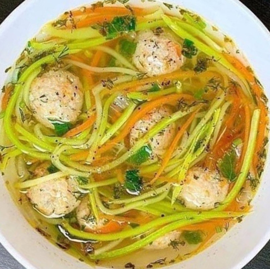 Рецепт: Кабачки Морковь Лук Помидоры Фрикадельки Соль, специи по вкусу⠀ ⠀ Овощечисткой нарезаем кабачки и морковь длинной соломкой. В кипящую подсоленную воду кладем фрикадельки, морковь и лук. Через 7 минут добавляем кабачки, помидоры и специи. Варим еще 3 минуты.