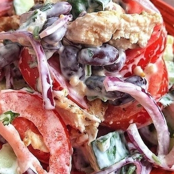 Ингредиенты: 250 гр. куриной грудки. 1 шт. яйцо куриное. 1 шт. Огурец свежий. Фасоль красная. 1-2 помидора. Красный лук 0,5шт. Кинза или петрушка. Соль. Перец. ⠀ Для соуса: Сметана 2 ст.л. Горчица 1 ч.л. ⠀ Готовим: Отвариваем куриную грудку, нарезаем кубиками. Огурец, красный лук, зелень, помидор, яйцо отвариваем и разминаем вилкой. Добавляем фасоль 150-170 гр. Всё перемешиваем, солим и перчим добавляем соус и ещё раз перемешиваем. ⠀ Приятного аппетита!