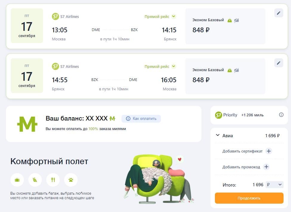 Милями S7 можно частично или полностью оплатить следующий билет. Брянск это будет или нет — не важно.