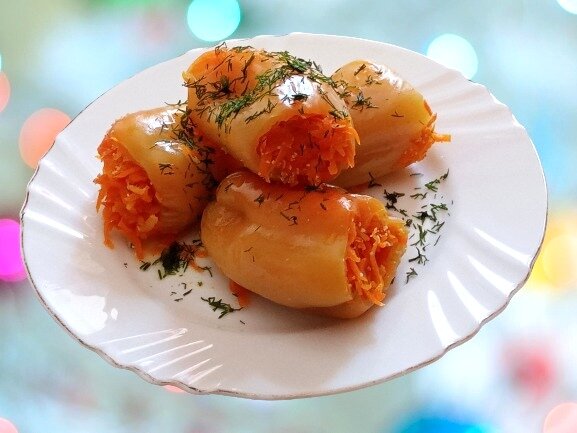 Ингредиенты: Приготовление: 3. Морковь и пастернак натереть на крупной тёрке, лук мелко нарезать. 4, В сковороде разогреть масло и обжарить лук до прозрачности. Затем добавить морковь и пастернак, уменьшить огонь до среднего и тушить овощи до полуготовности. В конце посолить по вкусу. Заполнить перец подготовленными овощами. На дно кастрюли выложите 2-3 столовые ложки начинки, затем поместите перцы. Влейте 150 миллилитров воды и добавьте лавровый лист. Тушите на слабом огне под крышкой в духовке или на плите в течение 30-40 минут. Украсьте блюдо зеленью при подаче.