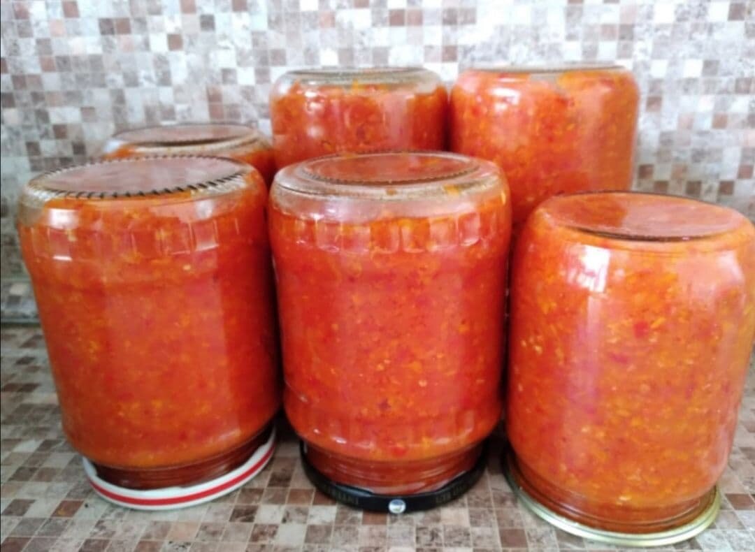 Для приготовления аджики нам потребуются: Помидоры -2,5 кг Болгарский перец - 0,8 кг Морковь - 0,8 кг Яблоки не сладкие - 0,8 кг Горький перец - 2 шт Чеснок - 3 головки Подсолнечное масло без запаха - 250 мл Сахарный песок - 200 гр Соль поваренная крупная - 2 ст. ложки без горки Уксус столовый 9% - 50 мл Приготовление: Из овощей нам понадобятся помидоры, перец болгарский, морковь, горький перец и чеснок. Овощи нужно помыть и почистить от плодоножек. В болгарском перце убираем семена, в горьком оставляем и прокручиваем вместе с семенами. Все овощи кроме чеснока пропускаем через мясорубку или кухонный комбайн Полученную массу перекладываем в кастрюлю, добавляем растительное масло, сахар и соль. Перемешать и поставить на огонь. Как только закипит, убавляем огонь и варим на медленном огне 30 минут. В процессе варки не забываем периодически помешивать. Крышкой закрывать не нужно. Через 30 минут добавить чеснок пропущенный через чеснокодавку. Перемешать и варить еще 20 ми