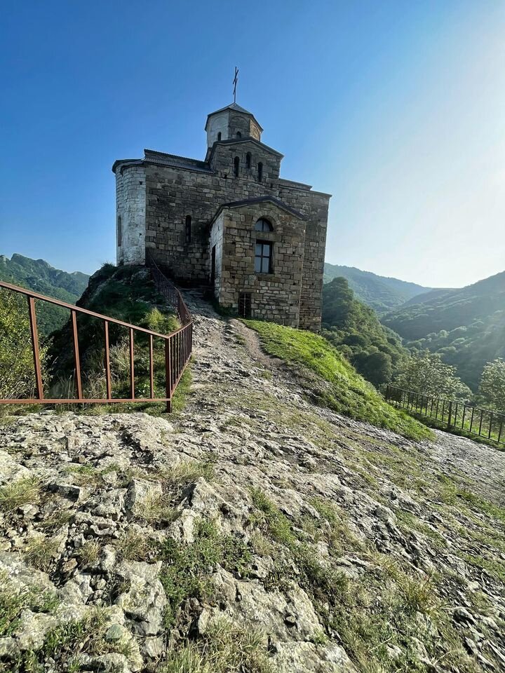 Шоанинский храм находится в 7 км от Карачаевска, рядом с селом имени Коста Хетагурова. Сначала вы поднимаетесь по живописному серпантину, а затем идете пешком по крутой винтовой лестнице на самую вершину. Гора называется Шоана (1130 метров). Территория вполне ухожена: стоят простенькие скамейки, растут дикие , мусора я нигде не нашла, зато встретила кошку и ящерицу. Здание построили в конце Х века, когда христианская вера пришла в тогдашнюю Аланию и стала активно теснить язычество. Как раз в эти времена здесь появились однотипные византийские храмы-крепости, выглядящие как братья-близнецы. Наш водитель сказал, что всего таких аланских купольных храмов-близнецов около тринадцати и все они на одно лицо. Я тут же подскочила на сиденье с воплем - вот бы их все объездить! Но мои спутницы не разделили моего энтузиазма исследовательницы. Церковь посвящена Святому Георгию, покровителю Кавказа. В осетинском "прочтении" - Уыстырджи. В здешних местах христианство имеет довольно аутентичный колор
