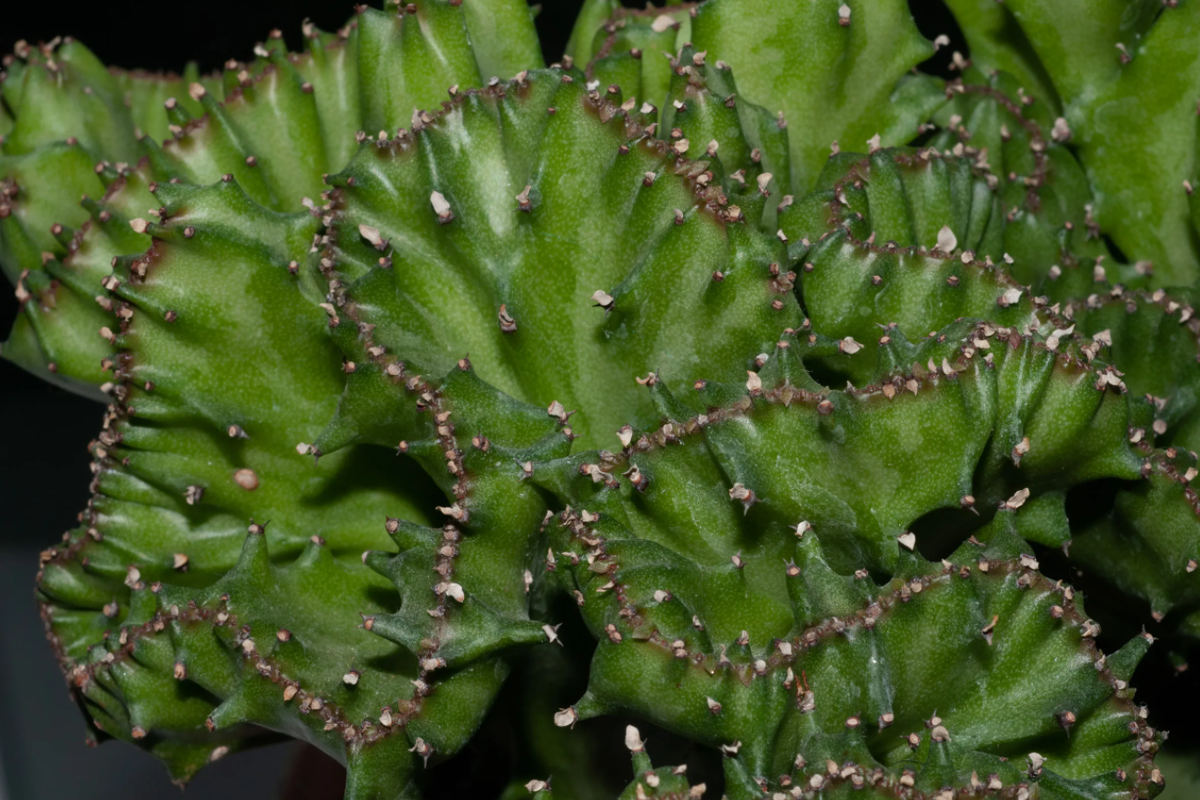 Euphorbia lactea, обычно называемая пестролистным отростком, - суккулентное растение, выносливое в 10 и 11 зонах жесткости растений Министерства сельского хозяйства России. Хотя в начале лета у пестролистного отростка появляются мелкие листья, они быстро опадают, и главным декоративным качеством растения являются его мясистые, похожие на кактус стебли. Как и большинство суккулентов, пестролистная шпорцевая имеет низкие требования к влажности, требуя лишь умеренного увлажнения. При неправильном поливе растение подвержено корневой гнили. 1