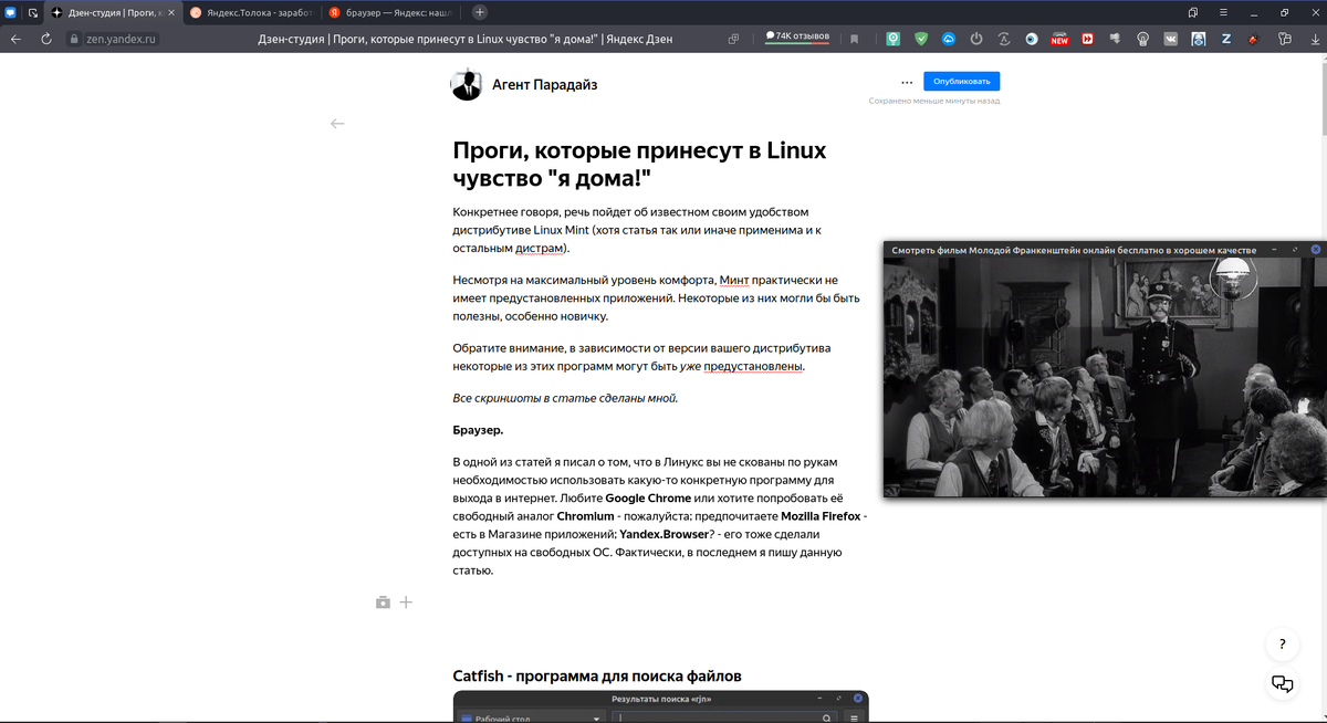 Конкретнее говоря, речь пойдет об известном своим удобством дистрибутиве Linux Mint (хотя статья так или иначе применима и к остальным дистрам). Несмотря на максимальный уровень комфорта, Минт практически не имеет предустановленных приложений. Некоторые из них могли бы быть полезны, особенно новичку. Обратите внимание, в зависимости от версии вашего дистрибутива некоторые из этих программ могут быть уже предустановлены. Все скриншоты в статье сделаны мной. Браузер. В одной из статей я писал о том, что с Линукс вы не скованы по рукам необходимостью использовать какую-то конкретную программу для выхода в интернет. Любите Google Chrome или хотите попробовать её свободный аналог Chromium - пожалуйста; предпочитаете Mozilla Firefox - есть в Магазине приложений; Yandex.Browser? - его тоже сделали доступным на свободных ОС. Фактически, в последнем из перечисленных браузеров я и пишу данную статью. сCatfish - программа для поиска файлов Конечно, в Линукс нет привычной по "Окнам" поисковой прог