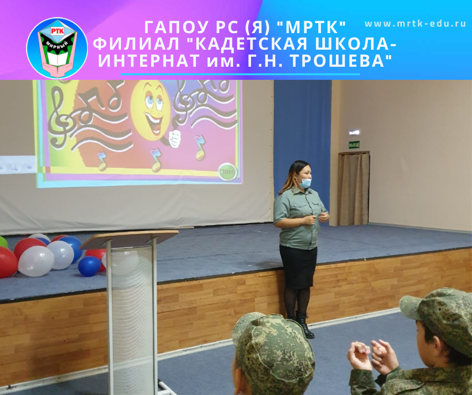 08 сентября 2021 года в Кадетской школе-интернат им. Г.Н. Трошева педагог-организатор Лариса Батлаева провела интерактивную игру «Угадай мелодию» с учащимися шестого класса, с целью воспитания духовно-нравственного развития, сплоченности в коллективе, а также создание условий для активного вовлечения кадет к музыкальному искусству. Класс был поделен на две команды и в каждой команде ребята выбрали себе капитанов. По итогам игры первая команда с небольшим отрывом вырвалась вперед и приняла участие в супер-игре. Во время всего мероприятия ребята принимали активное участие, обстановка была творческая и дружелюбная. Лариса Батлаева, педагог-организатор. Пресс-служба ГАПОУ РС (Я) «МРТК» филиал «Кадетская школа интернат им. Г.Н. Трошева». Ссылки по теме: